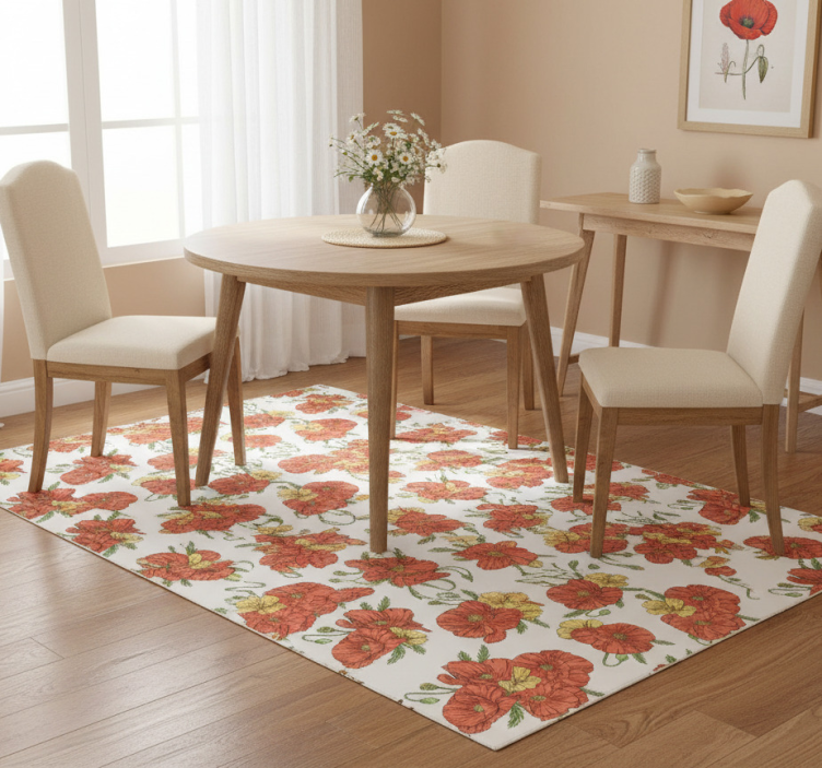 En Vinylmatta blommor och växter vallmo på vit bakgrund är en utmärkt dekoration för alla rum. Den livfulla designen ger en känsla av natur och fräschör, vilket gör att ditt hem känns mer inbjudande. Att använda en Vinylmatta blommor och växter bidrar till att skapa en lugn och harmonisk atmosfär, perfekt för avkoppling och sociala sammankomster. Låt din inredning blomma ut med denna fantastiska matta!
