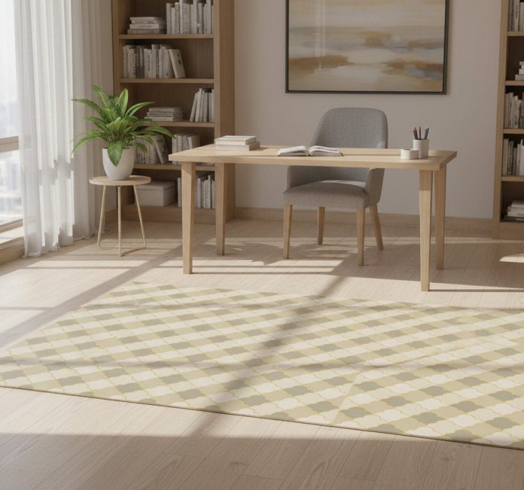 En vinylmatta geometrisk beige art deco mönster är en utmärkt val för att förvandla ditt hem till en stilfull oas. Genom att införa en touch av geometrisk elegans kan du enkelt lyfta inredningen och ge rummet en inbjudande atmosfär. Den varma beige färgen kompletterar olika färgscheman och skapar harmoni i ditt hem. Oavsett om du vill ha en modern eller klassisk känsla, är denna matta ett perfekt val för att ge liv åt dina utrymmen!