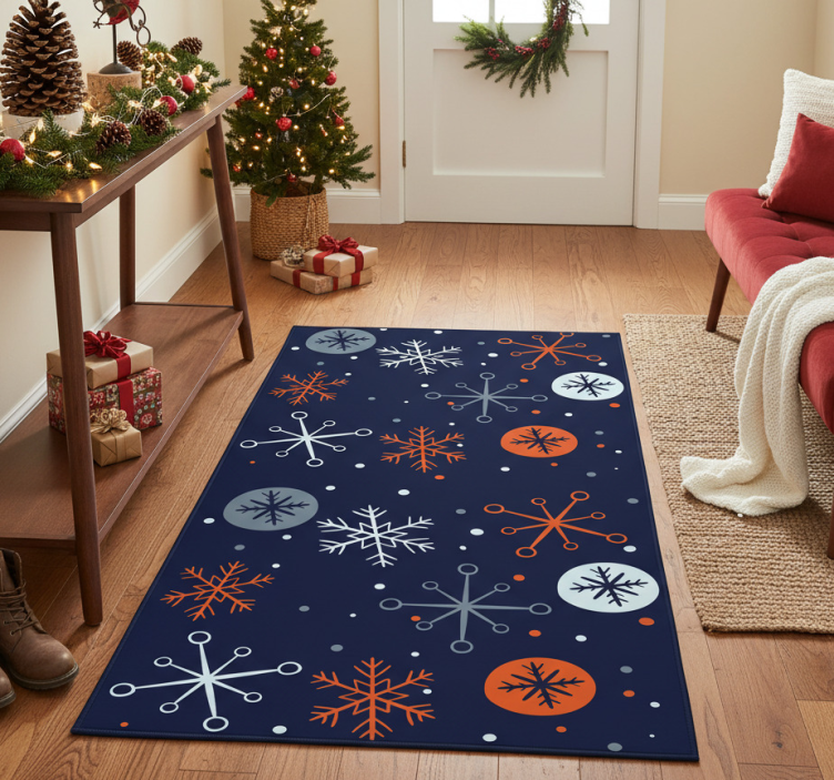 Att välja Vinylmatta jul blåa och orange snöflingor är ett utmärkt sätt att förvandla ditt hem till en julig oas! Denna Vinylmatta Jul ger en varm och inbjudande känsla som lyfter hela inredningen. Snöflingorna i livfulla färger kommer att sprida glädje och julstämning, oavsett var du placerar den. Låt denna matta bli en del av dina festligheter och skapa en magisk atmosfär för familj och vänner!