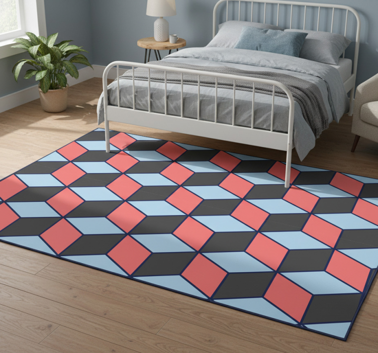 Referens: R21847Vår Vinylmatta sovrum geometriska rutor 3d erbjuder en fantastisk visuell upplevelse med sina livliga och moderna geometriska mönster som skapar djup och rörelse i ditt sovrum. Designen är både stilren och lekfull, vilket ger en unik touch till varje rum. Denna vinylmatta är inte bara vacker utan också praktisk, med egenskaper som halkskydd, rep tålig, och eldfast material som gör den säker och hållbar. Med sin lätta rengöring och termiska isolering är den perfekt för att skapa en mysig atmosfär där du kan koppla av!
