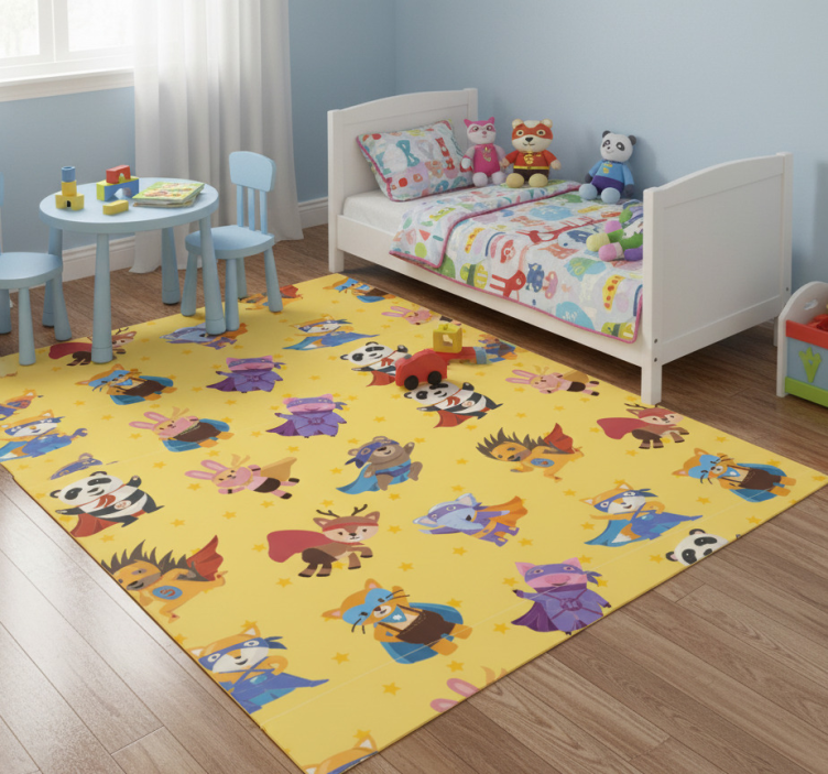 En Vinylmatta sovrum superhjältehusdjur mönster gul är den perfekta lösningen för att lyfta inredningen i ditt sovrum och skapa en lekfull och inbjudande atmosfär. Genom att använda en sådan här matta kan du enkelt förvandla en trist och vanlig yta till en färgstark och inspirerande plats där fantasin kan flöda! Dessutom skyddar den golvet och ger en mjuk känsla under fötterna, vilket gör den idealisk för både lek och avkoppling.
