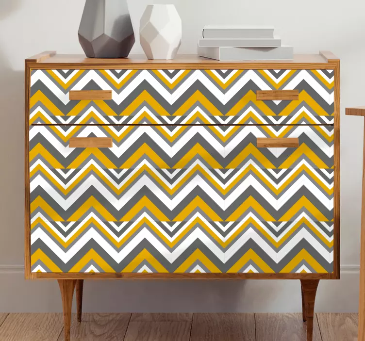 Välkommen till en värld av stil och elegans med våra Chevronöverlägg klistermärken till möbler! Dessa klistermärken har en modern och geometrisk design som utstrålar skandinavisk charm. Med sicksack-mönster och trianglar i en härlig kombination av gul och grå färger, ger de en unik touch till dina möbler och skapar en atmosfär av kreativitet och stil. Låt dina möbler bli konstverk med dessa fantastiska dekorationer!