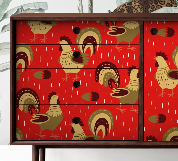 Upplev en färgsprakande värld med vårt Djur klistermärke lekfullt tuppmönster! Detta unika klistermärke pryds av livliga tuppar och djurillustrationer som skapar en lekfull atmosfär i ditt hem. Med ett mönster som är både färgrikt och fängslande, kommer detta klistermärke att förvandla dina möbler och väggar till en oas av kreativitet. Den röda färgen lyser upp rummet och ger en känsla av liv och glädje!