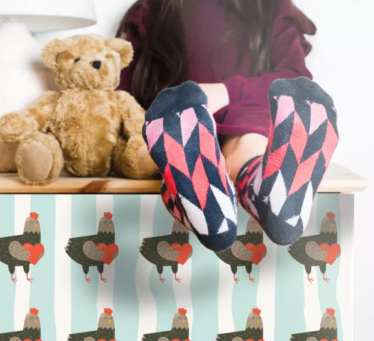 Välkommen till en värld av charm och färg med vårt Djur klistermärke med charmigt hönsmönster! Denna fantastiska design inkluderar söta tuppar och kycklingar som dansar bland hjärtan och ränder, vilket skapar en visuell fest för ögat. Med sitt färgrika och lekfulla mönster är detta klistermärke perfekt för att liva upp vilken möbel som helst och ge ditt hem en personlig touch. Oavsett om du vill odla en lantlig atmosfär eller bara för att njuta av de söta djuren, kommer detta klistermärke att förvandla ditt rum till en plats av glädje!