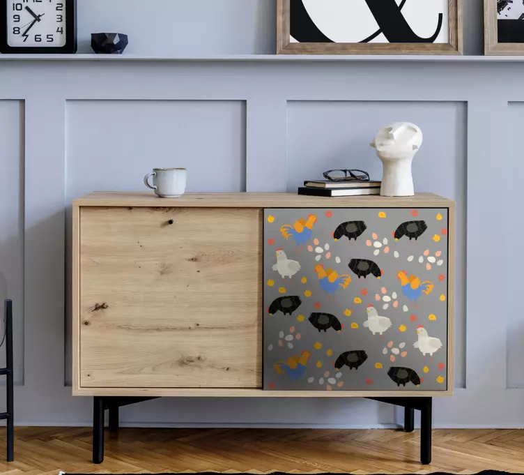 Referens: A52348En livlig komposition med olika gårdsdjur, inklusive färgglada höns och svarta hönor, utspridda över en ljus bakgrund. Denna lekfulla design skapar en upplyftande atmosfär, perfekt för att ge charm till vilket utrymme som helst.