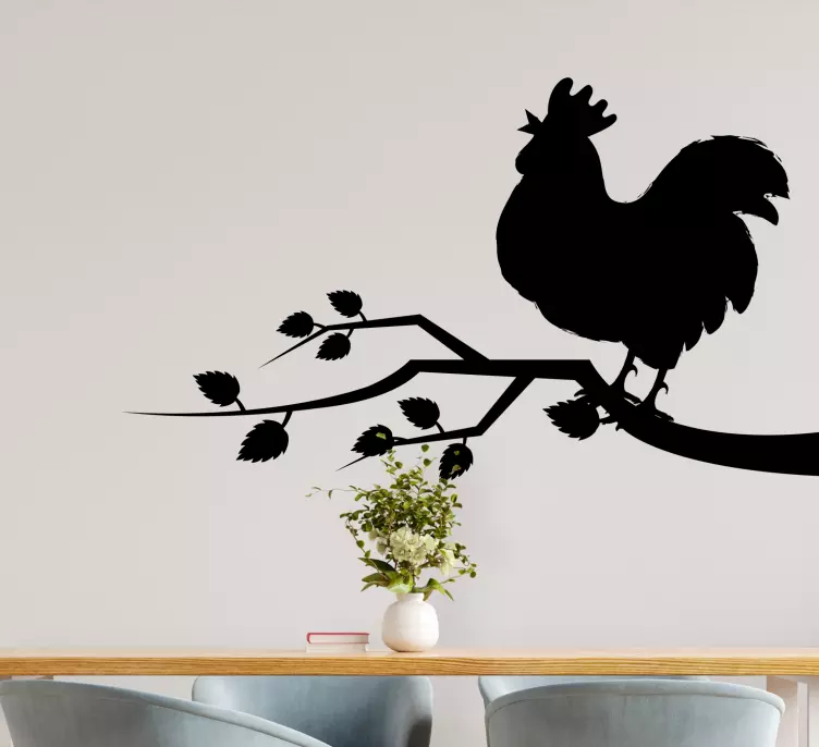Referens: A49034En slående silhuett av en tupp som sitter på en gren, som harmoniserar naturens element med lantliv. Grenen prydd med blad ger en organisk känsla, vilket förstärker den rustika stilen i designen, perfekt för att tillföra en lantlig charm till vilket utrymme som helst.