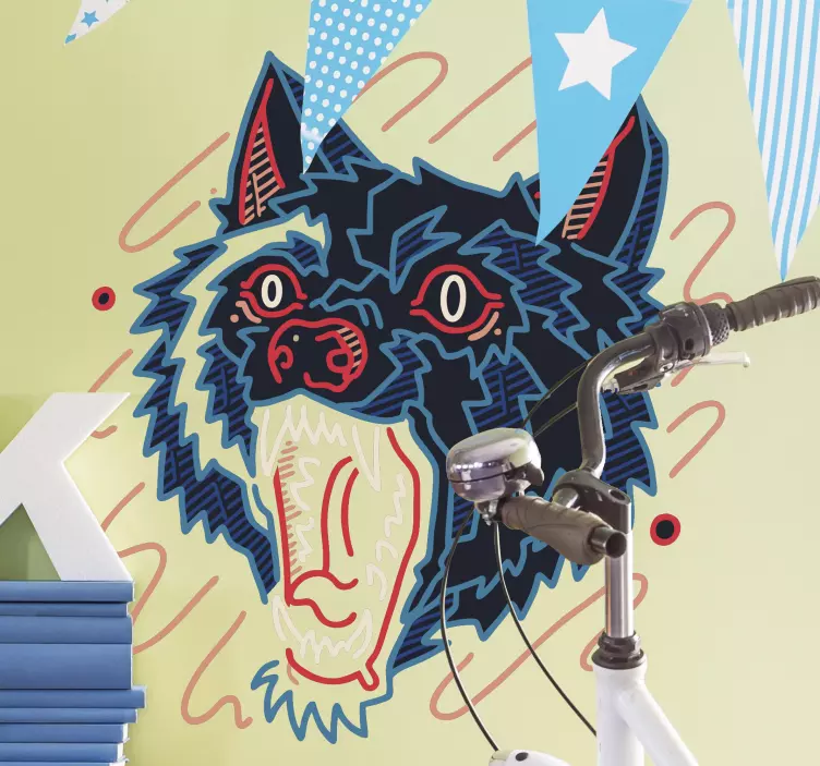 Referens: A47966En slående grafik av en ylande varg visar djärva färger och dynamiska linjer. Vargens vilda uttryck och överdrivna drag skapar en lekfull men kraftfull visuell effekt, perfekt för att energisera vilket utrymme som helst. Denna design fångar essensen av vildhet och anda, och tilltalar älskare av djur och unik konst.