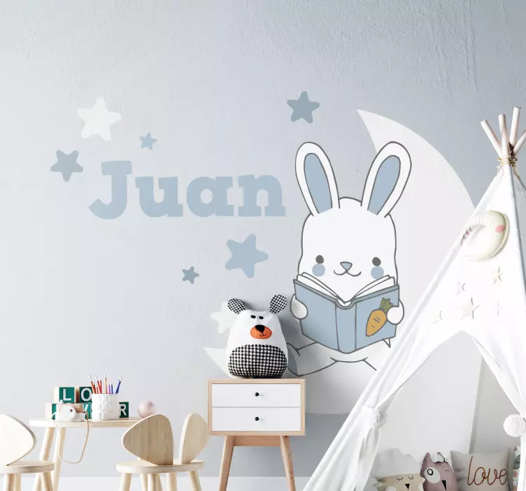 Kaninläsning på månen med namnillustration väggkonst