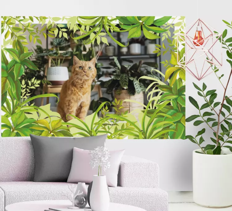 Referens: A48313En charmig scen med en uppmärksam katt omgiven av frodig grönska. Designen fångar essensen av natur som vävs samman med hemmets komfort, och visar kattens nyfikna beteende bland en mängd inomhusväxter.