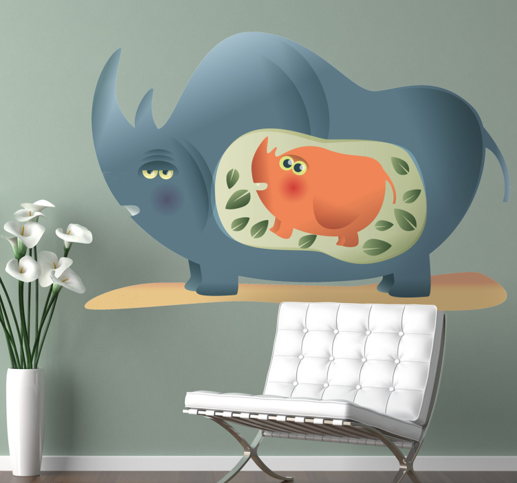 Upptäck vår lekfulla djurillustration vilda djur klistermärke, som tar designen till nya höjder med en charmig och färgrik grafik. Med en tecknad serie av en noshörning, tillsammans med en bebis och en mamma som är gravid, omgiven av löv, skapar den en nyckfull och livfull atmosfär. Denna djur-design är perfekt för att lysa upp vilket rum som helst!