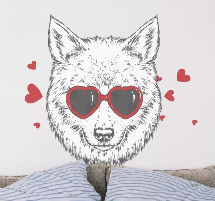 Referens: A47972En charmig avbildning av en varg som bär ”heart-shaped sunglasses”, som utstrålar en rolig och kärleksfull känsla. De omgivande hjärtana förstärker dess lekfulla natur, vilket gör det till ett härligt val för att ge karaktär åt vilket utrymme som helst.