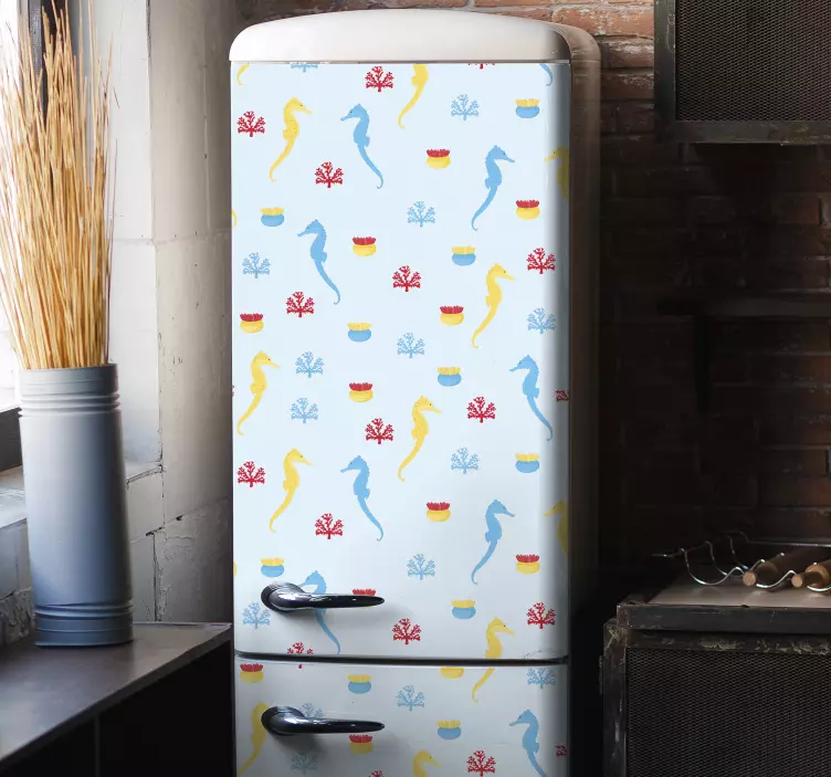 Denna dekorativa kylskåpsdekal innehåller en illustrativ design av färgglada sjöhästar med koraller på en vit bakgrund. Genom att använda denna design kan du enkelt förändra utseendet på ditt kylskåp och ge det ett vackert och attraktivt utseende.