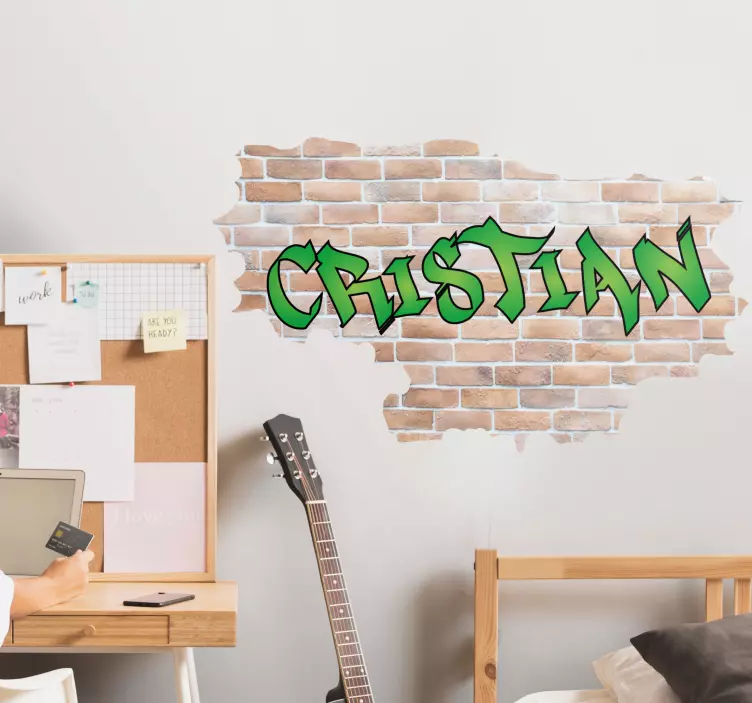 Referens: A49602Ett livfullt urban-tema element med ett anpassat namn i graffiti-stil, placerat mot en tegelvägg. Denna produkt ger en tuff stil till vilket utrymme som helst, och möjliggör personlig anpassning för att skapa ett unikt uttryck.