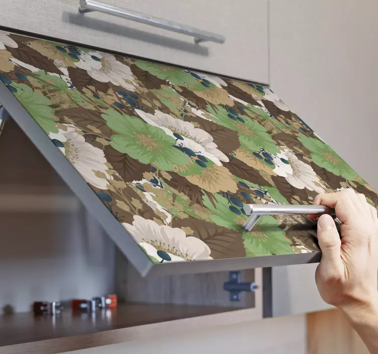Upprepat i flera färger med en attraktiv uppmärksamhet som du kommer att älska på ytan. Den gröna, bruna och vita färgdesignen på blomman gör den till en perfekt matchning för dina möbler i köket eller för att användas på speciella utrymmen i ditt hem. Med denna möbeldekal kommer du att njuta av att använda ditt utrymme och beröringen som den ger till utrymmet.