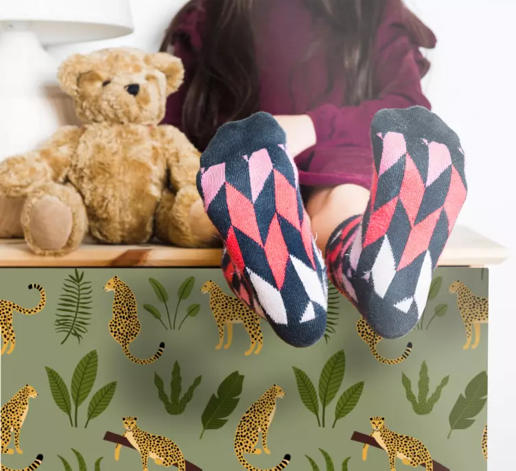 Upplev den vilda naturens skönhet med vårt Vilda djur klistermärke leopardmönstrad djungel! Denna fantastiska design fångar ögonen med sina eleganta leoparder och ett livligt mönster av djungelväxter och löv. Den tropiska känslan förvandlar vilken yta som helst till en äkta djungel, och de blommiga inslagen ger en fräsch och grön atmosfär. Låt detta klistermärke ge liv åt dina möbler och skapa en unik inredning som verkligen sticker ut!