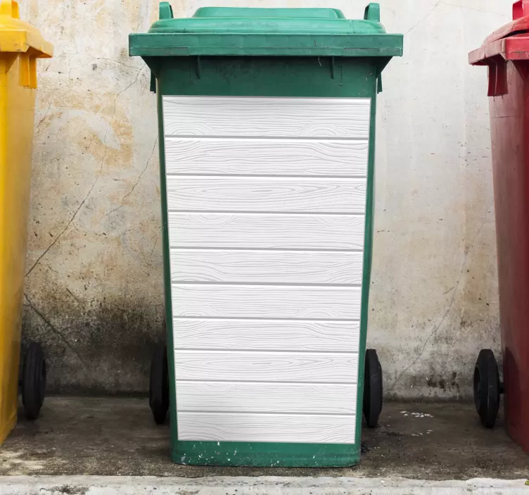Få en naturlig och ren design genom att täcka dina snygga monokolorerade plastfack med våra träklistermärken. Var avundsjuka i grannskapet med en avslappnande design som matchar dina vita trästaket. Flytta och sätt in papperskorgen med stil samtidigt som du skyddar dina containerers hållbara livslängd med vårt skyddande lager. Om du tröttnar på designen är det inga problem, ta bort den och få en ny på. Vår högkvalitativa vinyl för förvaring utomhus ger inga skador eller rester. Hämta din nu och ge din trädgård den extra touchen den förtjänar!