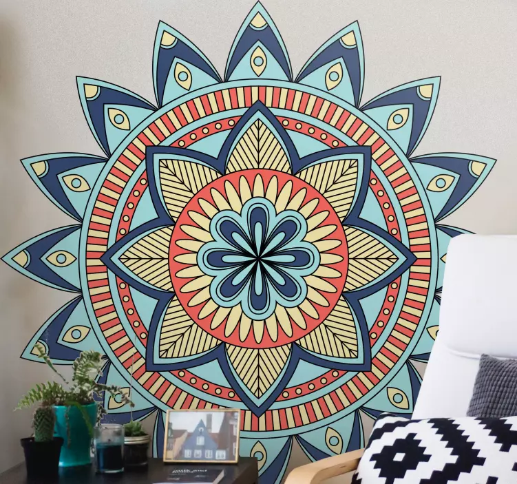 Upptäck det fantastiska Vivid mandala motiv geometrisk klistermärke, en fängslande design som kombinerar blommiga och geometriska element med en färgrik och livfull illustration. Denna konstverk förvandlar varje rum till en oas av skönhet och harmoni. Med sin unika design är detta klistermärke mer än bara dekoration – det är en visuell fest som ger liv och energi till din inredning!